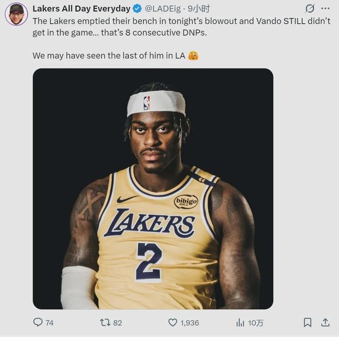 连双向合同球员德鲁-蒂米都上场打了6分38秒,克莱伯甚至打了15分钟!湖人自媒体Lakers All Day Every Day写道:“湖人换上了所有替补,范德比尔特却没能出场。连续8场被DNP,我们也许已经看过了他在湖人的最后一场比赛。”